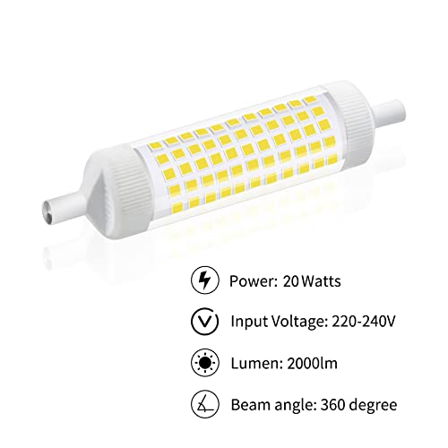 【Base da 118mm tipo J R7s】Dimensioni della lampadina: 118mm * 23mm (4,65 pollici * 0,9 pollici). Si prega di verificare se le dimensioni si adattano al tuo dispositivo. Potenza 20w, 1500LM, AC200-240V, angolo del fascio 360°. Immediato alla massima luminosità, nessun sfarfallio, nessun ronzio.