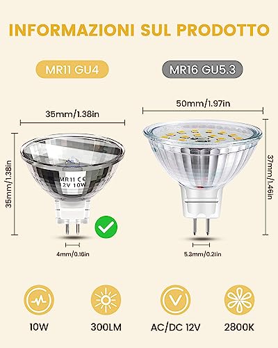 Luce confortevole: queste lampadine MR11 con luminosità di 300 lumen forniscono una luce bianca calda e luminosa (2800 K), creano un'atmosfera calda e confortevole. Immediatamente a piena luminosità, senza sfarfallio e nessun abbagliamento abbagliante previene l'affaticamento degli occhi.