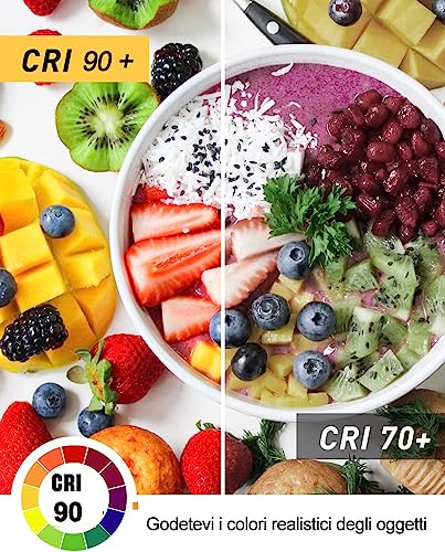 【High CRI】 L'indice di resa cromatica (CRI) di 90, la luce è vivida e naturale, ripristina il vero colore dell'oggetto nella massima misura, offre un vivo godimento visivo con colori originali. Con un ampio angolo di fascio di 30°, l'ambiente è generosamente illuminato.