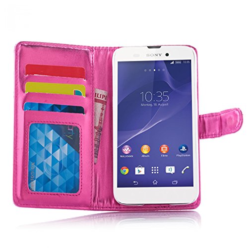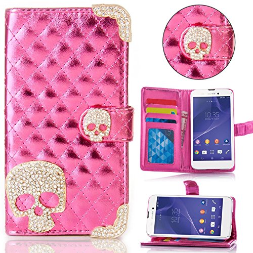 Book Style Design Custodia Karo Metallic porta biglietti da visita con funzione di strass Ornato Oro Bordi e strass teschi Flip Cover Custodia Rigida Pieghevole Custodia Modern Bag per Sony Xperia T3 in Pink
