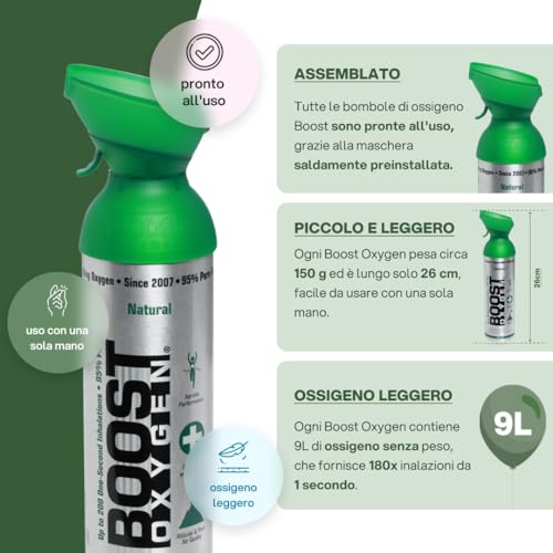 Boost Oxygen - Bombola di Ossigeno Portatile - Bomboletta di Ossigeno Puro e Naturale al 95% - Concentrazione, Recupero, Energia, Umore, Largo - 9Lt (1x Pacco - 150 Inalazioni) - Naturale