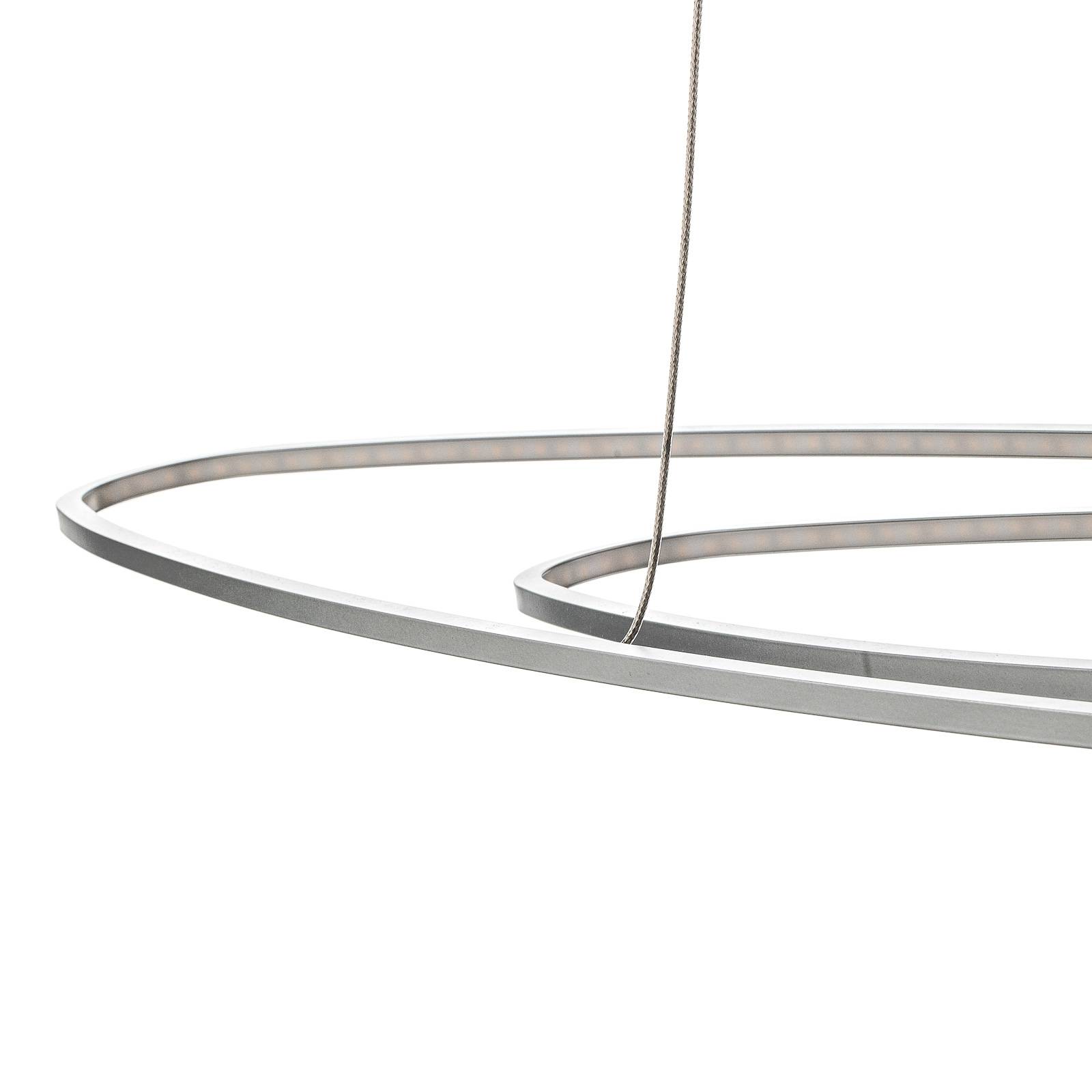 Lampada a sospensione LED filigranata Flair a forma di ellisse - made in GermanyLa lampada a sospensione LED Flair ha una struttura molto sottile e filigranata ed è costituita da un profilo di alluminio a forma di ellisse. All'interno di questo profilo è incastonata una striscia LED continua che produce una luce bianca calda. La luminosità di questa luce può essere regolata tramite un dimmer a parete (dimmer non incluso). Il fatto che l'apparecchio nel suo complesso non solo risulti molto puristico, ma possa anche apparire leggermente stravagante, è dovuto alla speciale sospensione, con l'aiuto della quale l'apparecchio può essere appeso anche ad angolo. Flair non è solo una sorgente luminosa molto moderna, sia in termini di tecnologia che di stile, ma anche una piccola opera d'arte luminosa con un tocco di lampada di design. Questo apparecchio a sospensione è un modello del produttore di apparecchi BOPP, che produce esclusivamente in Germania.