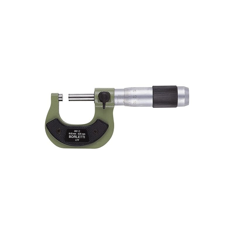 Micrometro centesimale per esterni completo di riscontri di azzeramento. Alle caratteristiche di alta qualità costruttiva è unita quella della maneggevolezza che rende tale tipo di micrometro particolarmente adatto a operatrici di controllo, tecnici di officina, riparatori e addetti al servizio di assistenza. Arco in acciaio legato, forgiato e coniato, verniciato e dotato di piastre isolanti. Vite micrometrica temprata e stabilizzata. Contatti in metallo duro, rettificati e lappati con elevato grado di planarità e parallelismo e rugosità Ra = 0,03 µm. Tamburo graduato Ø mm 17 munito di ghiera di frizione. Bloccaggio a leva di facile utilizzo. Gli strumenti sono forniti in solido astuccio e dotati di certificato di garanzia. Precisione secondo: Norme DIN 863 - UNI 5708 - ISO 3611. Dati tecnici: campo di misura: 75÷100 mm, risoluzione nonio: 0,01 mm, diametro asta vite: 6,5 mm, passo vite: 0,5 mm