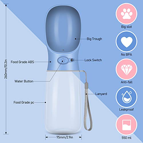 [Portatile e A Prova di Perdite] - La bottiglia d'acqua di grande capacità può contenere 550 ml di acqua.Il pulsante medio e un lucchetto oltre al pulsante assicurano che il biberon del cane non coli, mantenendo la borsa asciutta e pulita. Facile da trasportare e mettere in borsa per il suo profilo sottile durante i viaggi, le passeggiate, le escursioni