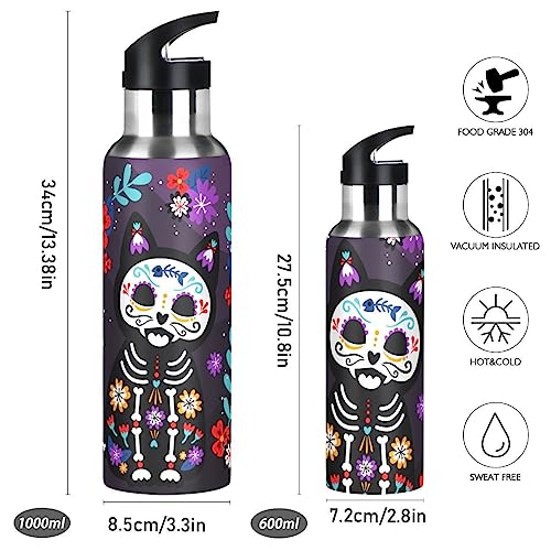 Borraccia termica con cannuccia, motivo teschio di zucchero, con coperchio messicano, per bambini, in acciaio inox, 1000 ml, per caldo e freddo