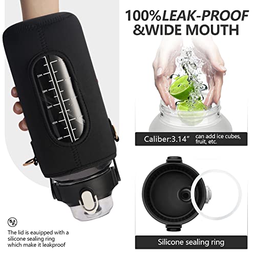 Borraccia in vetro 1814 ml, con cannuccia e coperchio maniglia, custodia per riporre oggetti, bottiglia in vetro riutilizzabile e motivazionale per sport, con indicatore del tempo stagna BPA, nero