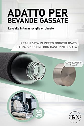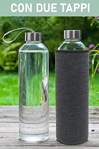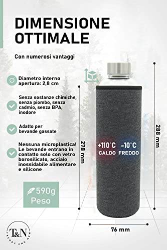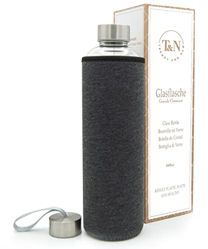 T&N Borraccia di vetro da 1 litro, con custodia in neoprene, bottiglia per acqua 1l a prova di perdite, bottiglia in vetro borosilicato spesso per anidride carbonica