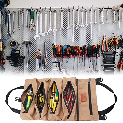 Borsa Attrezzi Arrotolabile, Tasca Porta Attrezzi, Borsa Portautensili in Tela, Multiuso Borsa Portautensili Portatile con 5 Tasche Cerniera per Trapani, Pinze, Guanti, Cacciaviti, Kaki