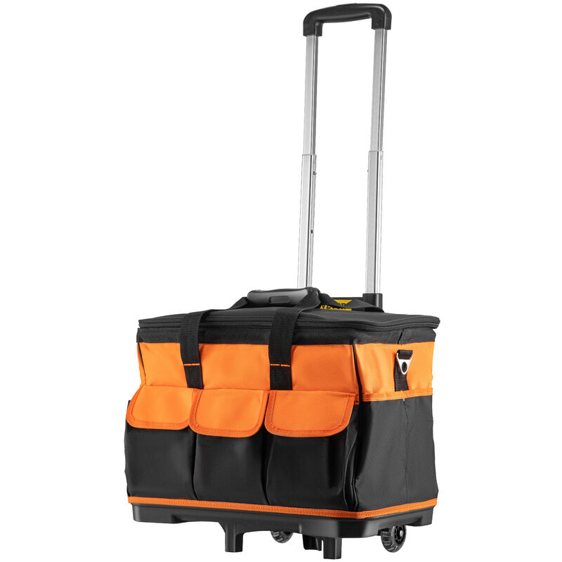 Borsa per Attrezzi da 18 pollici con Rotelle La nostra borsa degli attrezzi ha 17 tasche per contenere i tuoi attrezzi manuali preferiti. Questo borse degli attrezzi è lo strumento perfetto per farti risparmiare il viaggio quando hai bisogno dei tuoi strumenti. Gli ampi scomparti principali offrono ampio spazio per riporre utensili e apparecchiature elettriche compatte. Inoltre, è dotato di una robusta maniglia telescopica e di ruote che ne consentono una facile mobilità. Rotelle stabili da 2,56 pollici Borsa per attrezzi di grande capacità Capacità di carico migliorata 17 tasche di facile accesso Caratteristiche & Dettagli Rotelle Stabili da 2,56 Pollici: questa borsa per attrezzi con ruote è dotata di ruote trattate per impieghi gravosi per un facile spostamento su terreni accidentati. Tre modi di trasporto rendono questa borsa degli attrezzi con ruote facile da trasportare. Borsa degli Attrezzi di Grande capacità: ha una capacità totale di 1,4 piedi cubi. L'ampio interno di questa