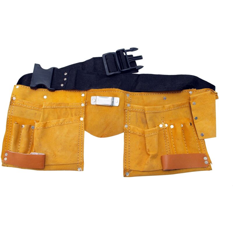 Composta da 11 tasche (4 tasche per attrezzi piccoli e 7 per grandi), 2 scomparti porta martelli e 1 supporto per metro. Cintura regolabile in nylon.