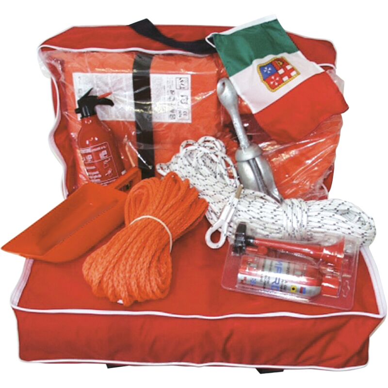 Borsa dotazione sicurezza per 4 persone (solo per giubbotti Veleria San Giorgio). Costruita in nylon pesante spalmato in PVC all'interno per garantire l'impermeabilità, chiusura con zip in materiale plastico antisalino. Il kit contiene 4 giubbotti salvagente 100N UNI EN ISO 12402-4, n. 1 ancora ombrello da Kg. 2,5, n. 1 cima per ancora ø mm. 8 da mt. 30, n. 1 bandiera Italia Mercantile, n. 1 sessola, n. 1 cima galleggiante peranulare ø mm. 8 da mt. 30, n. 1 estintore da Kg.1, n. 1 tromba a gas.Dim. mm. 450x360x360H