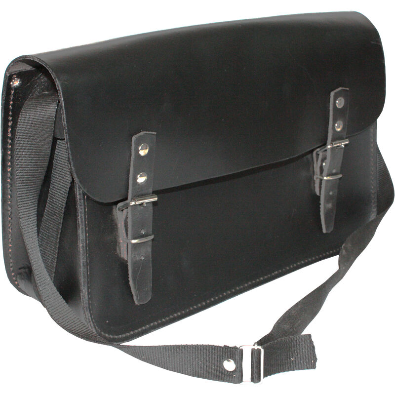 In cuoio nero lucido. Con tracolla e pattina salvaspalla. Dimensioni mm 400x140x240h