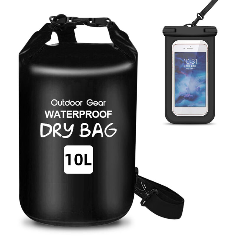 Realizzato in materiale PVC resistente all'usura. Dispone di un ampio scomparto principale con chiusura roll-top. Puoi lasciare la borsa asciutta galleggiare sull'acqua durante il viaggio sul fiume, senza preoccuparti che i tuoi oggetti si bagnino. Il design universale si adatta a tutti gli smartphone fino a 6,5 pollici, rendendolo perfetto per proteggere il tuo dispositivo o smartphone. Bella combinazione per spiaggia, canottaggio, rafting, kayak, nuoto, pesca con il surf, ecc. Caratteristiche: Vieni con una borsa stagna da 10 litri e una custodia per telefono. Realizzato in materiale PVC super resistente, a tenuta stagna e ultra resistente. Design arrotolabile con fibbia di qualita, sicuro e a prova di perdite. (Sacca asciutta) Dispone di una cinghia singola per borsa asciutta da 10 litri, due cinghie per zaino impermeabile da 20 litri. (borsa asciutta) Operazione semplice, basta mettere la tua attrezzatura nella borsa, arrotolare saldamente 3 o 4 volte e quindi collegare la fibbia