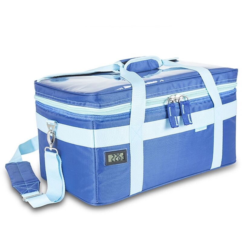 garantizando en todas éstas el correcto transporte y refrigeración de los materiales alojados en su interior. La bolsa isotérmica, diseñada para alojar el material sanitario más delicado y mantenerlo protegido, consta de un compartimento isotérmico principal que dispone de un termómetro, un bolsillo superior plano y transparente, asas y bandolera. Además, este estuche sanitario para transportar muestras dispone de tres compartimentos isotérmicos extraíbles, los cuales cuentan todos con esponja para absorver posibles derrames. El compartimento extraíble principal cuenta con cuatro gradillas acolchadas, una capacidad de 44 tubos cada una y bolsas herméticas para impedir fugas. Otro compartimento extraíble, que sirve para colocar los botes de orina, con bandas de fijación y sistema