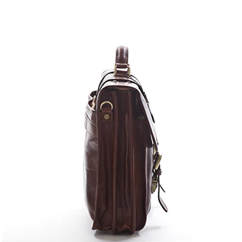 ESTERNI: - pelle pieno fiore conciata la vegetale e tamponata a mano - costruzione morbida - chiusura con due tuc (chiave in dotazione) - due soffietti - manico in pelle - due tasche frontali - tracolla in pelle rimovibile e regolabile - tasca posteriore con chiusura a zip - passante posteriore per trolley - accessori in metallo