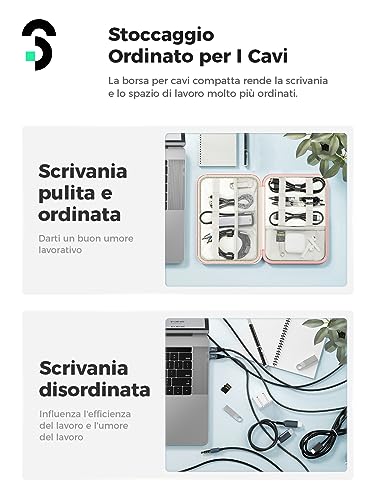 【Grande Capacità】 L'organizer per cavi offre ampio spazio di archiviazione. Il design degli scomparti garantisce lo stoccaggio di diversi tipi di accessori elettronici. Gli elastici sono piacevolmente tesi e tengono tutto a posto con facilità. La tasca in rete mantiene i cavi e gli accessori elettronici visibili e traspiranti.