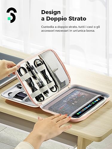 【Design a Doppio Strato】 La dimensione di questa borsa elettronica è 24 × 18 × 4 cm (L x P x A). 2 sezioni separate, uno strato è per riporre piccoli oggetti, come cavi USB, schede SD, cuffie bluetooth, pen drive, hub e caricabatterie, ecc. L'altro strato può contenere dispositivi più grandi, come power bank, adattatore, disco rigido, piccoli E-Reader, iPad mini, ecc.