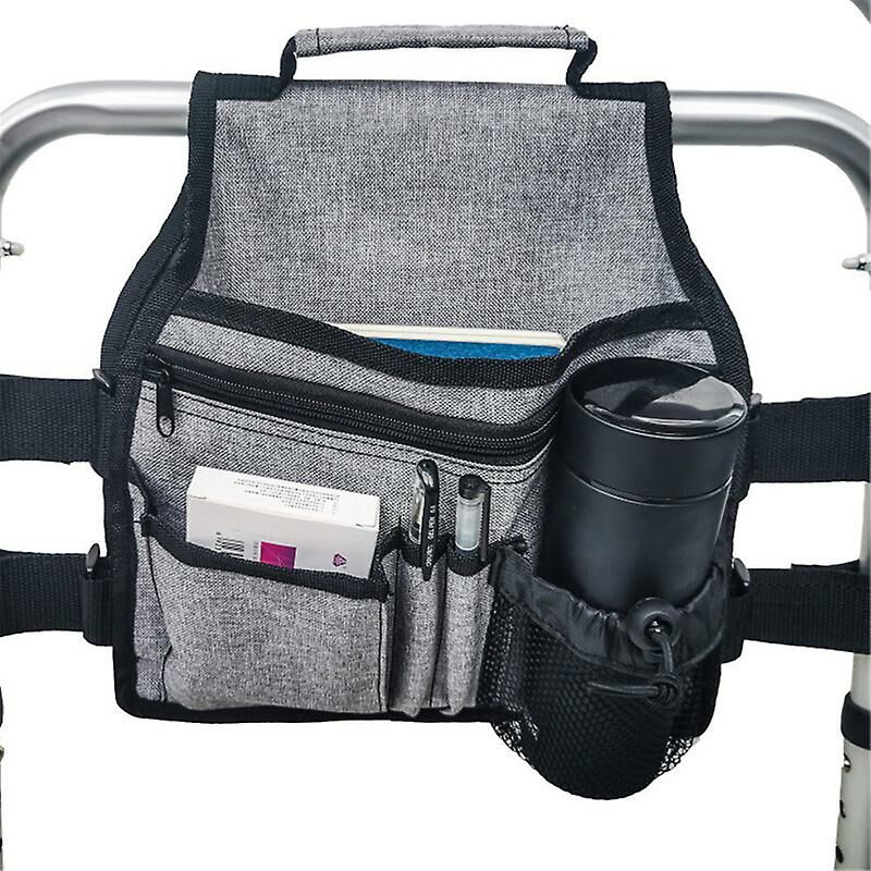 Taglia: 59,3 x 26 cm Tessuto: Poliestere Quattro velcro a posizione fissa regolabile e indipendente. Facile da collegare al lato di qualsiasi stile. Utilizza tessuto Oxford di alta qualità con rivestimento interno impermeabile in PVC, durevole e resistente all'usura, lavabile in lavatrice Borsa Walker a doppia faccia con multi tasca il design può soddisfare la maggior parte delle necessità quotidiane. Le tasche multiple frontali e una borsa per bicchieri d'acqua, che può contenere oggetti di uso frequente e tazze d'acqua. La parte posteriore ha una tasca con bottone che può essere tranquillamente riposta in portafogli, medicinali e altri oggetti di valore.