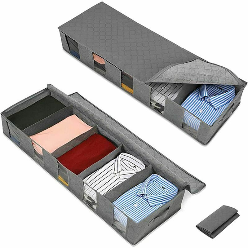 Grande capacità: borsa portaoggetti sotto il letto con grandi dimensioni di 97 x 33 x 15 cm. 2 borse soddisfano le tue numerose esigenze di archiviazione. La cerniera è ideale per proteggere i tuoi vestiti da polvere, sporco e umidità. Design eccellente: borsa portaoggetti sotto il letto costruita con ampie finestre trasparenti nella parte anteriore per una rapida visualizzazione di ciò che è conservato all'interno del contenitore. Sono disponibili 5 scomparti della stessa dimensione, per ordinare i tuoi accessori in modo rapido e ordinato. Risparmia spazio: questa borsa organizer per vestiti può essere piegata per una dimensione compatta di 35,6 x 25,4 x 2,5 cm. È facile da impilare o trasportare da un posto all'altro con le maniglie per il trasporto, che offrono un comodo spazio di archiviazione Durevole e traspirante: le scatole portaoggetti sotto il letto sono realizzate in tessuto non tessuto.tessuto di alta qualità, traspirante e leggero, resistente e antipolvere. Ottimo da