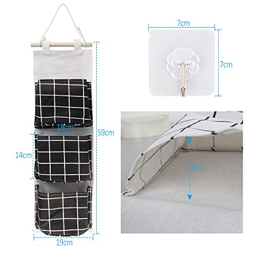 Borsa portaoggetti con tasche in 3 pezzi, Portaoggetti da Parete Borsa Appeso per cucina camera da letto bagno ufficio, cotone + legno, nero bianco e grigio