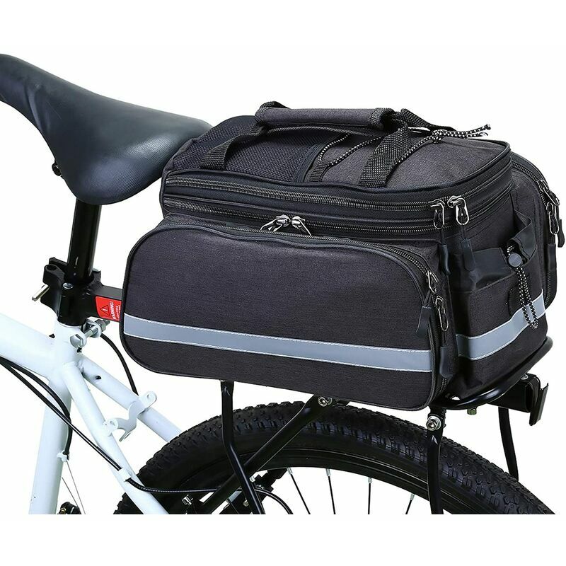 Materiale impermeabile - Realizzato in tessuto oxford 600D di alta qualità, resistente, liscio, resistente alla pioggia, durevole, antigraffio. La copertura antipioggia (inclusa) fornisce una protezione extra per gli oggetti all'interno. Capacità espandibile da 10 a 25L - Dimensioni piegate: 32 * 17 * 19 cm / 12,6 * 6,7 * 7,5. 2 ampie tasche laterali (35*28 cm), 1 tasca posteriore elasticizzata per borraccia o guanti, 1 tasca superiore in rete per impermeabile o cuffia antipioggia, 1 cerniera per aumentare la capienza. Strisce riflettenti e luce posteriore -- - Um Per migliorare la visibilità degli altri durante la guida notturna, sulla borsa sono presenti diverse strisce riflettenti che possono essere attaccate sul retro di questa borsa da bici. Varie opzioni di trasporto - -- Con una tracolla di 70-130 cm, questa borsa da bici non solo può essere attaccata al sedile posteriore della bici, ma anche portata a mano o sulla spalla. Facile da attaccare - Ci sono 2 strisce