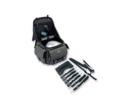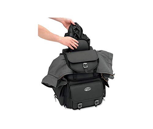 La robusta miscela di materiali in pelle a grana ha un buon look su qualsiasi tipo di moto. La struttura interna rigida è abbastanza forte da appoggiarsi contro anche quando è vuota. Non è necessario sissy bar. Due sistemi di montaggio inclusi: il supporto di imbracatura Versa Saddlemen o il sistema di cinghia regolabile di Sissy Bar per attaccare facilmente la borsa alla sella di moto, portapacchi o sissy bar. Il cuscino