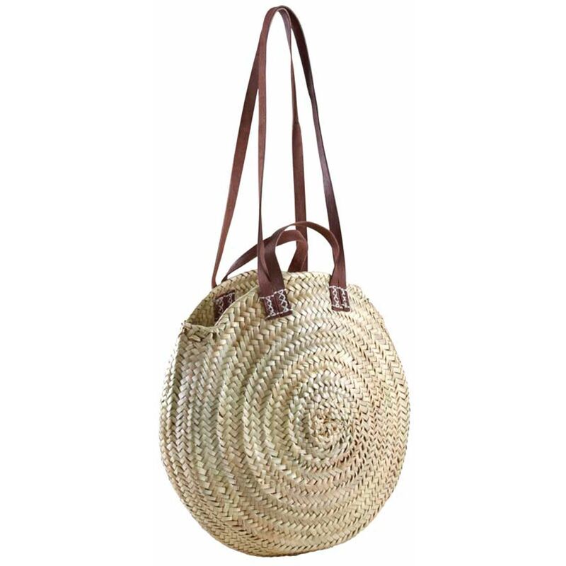 Aspect: Coloris: Marron (bandoulière et poignées) Matériau principal: Palmier Matériaux secondaires: Cuir (bandoulière et poignées) Dimensions: Diamètre (en cm): 40,00 Hauteur (en cm): 10 Cabas rond en palmier bandoulière et poignées