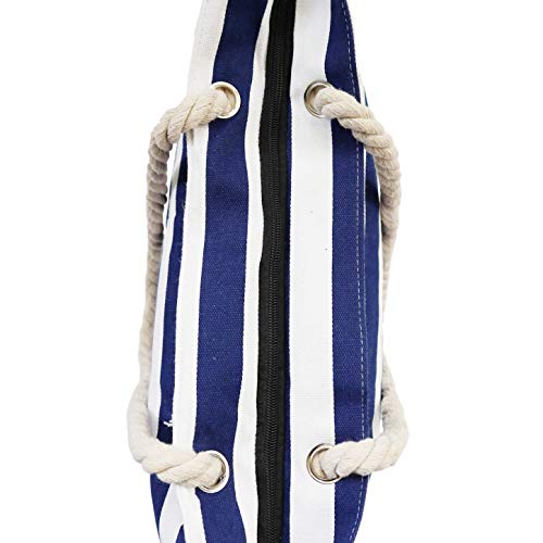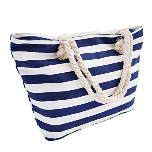 Borsa Shopper Grande Da Spiaggia In Tela Con Chiusura Cerniera Zip Donna Bambina Da Mare Stampa Fantasia Righe Elefante Indie Ancora Nera Blu Azzurra A Spalla Manici Corda (righe blu)