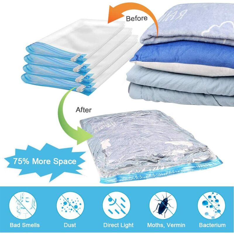 1 busta in 4 diverse dimensioni - La busta sottovuoto contiene 1 busta sottovuoto: 1 * XL (70x50 cm) + 1 * L (60x40 cm) + 1 * M (50x40 cm) + 1 * S (50x35 cm). RISPARMIA SPAZIO - Comprimendo l'aria nel bucato, il sacco per la conservazione sottovuoto può ridurre il suo volume fino al 75%. Questo sacco sottovuoto è ideale per ridurre lo spessore dei tuoi vestiti e quindi ottimizzare lo spazio di archiviazione. Ermetico e impermeabile - La doppia cerniera e le clip di chiusura garantiscono una tenuta perfetta e una compressione ottimale per ogni sacco sottovuoto da viaggio per fornire eccellente protezione per i tuoi vestiti da umidità, sporco, odori e parassiti. Facile da usare: non c'è bisogno di pompa, le borse per la conservazione sono pronte per l'uso, lo scarico dell'aria arrotolando la borsa, puoi riponi i vestiti nei sacchetti e poi riponi i sacchetti in valigia. Alta qualità - I sacchetti a compressione sottovuoto sono realizzati in PE e PA multistrato, riutilizzabili e