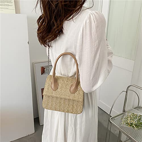 Borsa da spiaggia estiva in paglia, borsa da donna elegante in paglia PU pelle splicing estate spiaggia borsa a tracolla, cachi