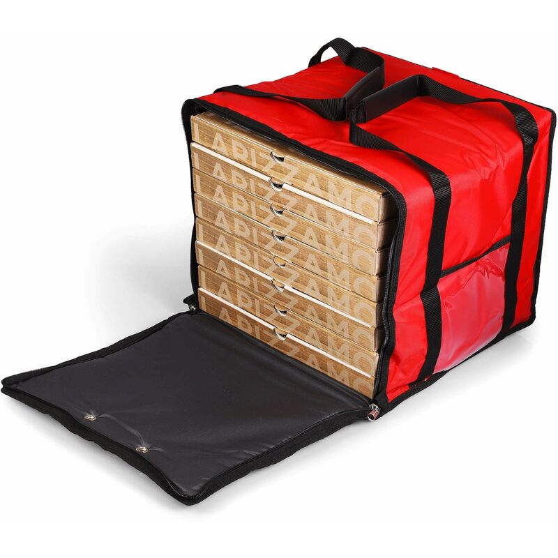 Borsa Porta Pizza Borsa Termica Porta Pizze da Asporto 8/10 Cartoni Safemi Express 10 Rossa Borsa termica per pizze da asporto Made in Italy, realizzata in Nylon plastificato ( antipioggia, antigraffio, antistrappo, resistente e facile da pulire ) con comode maniglie per trasporto rinforzate con gommini. Occhielli laterali per la fuoriuscita della condensa. Dotata di chiusura a zip isolante e doppia tasca laterale trasparente, di cui una con grandezza A4 ideale per il logo della pizzeria . Può contenere un massimo di 10 pizze. Caratteristiche Tecniche Borsa Termica Porta Pizze Safemi Express 10 Dimensioni (LxPxA): 34 x 34 x 33 cm Dimensioni Cartoni pizze: 33 x 33 cm Ideale per 8 Cartoni (altezza 4 cm) / 10 Cartoni (altezza 3 cm) Spessore: 1 cm Prodotto Made in Italy Tra i prodotti più buoni della cucina italiana vi è ovviamente la pizza. Ma quante volte ci siamo trovati a dover riscaldare la pizza in microonde ? Non è veramente una soluzione. L'impasto diventa gommoso e, come