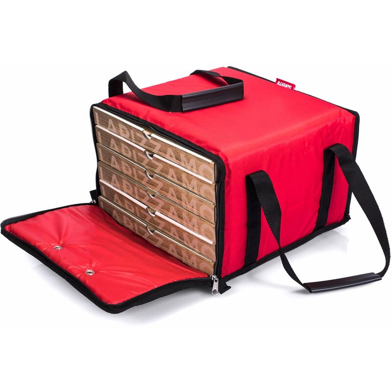 Borsa Porta Pizza Borsa Termica Porta Pizze da Asporto 5/6 Cartoni Safemi Express 6 Rossa Borsa termica per pizze da asporto Made in Italy, realizzata in Nylon plastificato ( antipioggia, antigraffio, antistrappo, resistente e facile da pulire ) con comode maniglie per trasporto rinforzate con gommini. Occhielli laterali per la fuoriuscita della condensa. Dotata di chiusura a zip isolante e doppia tasca laterale trasparente, di cui una con grandezza A4 ideale per il logo della pizzeria . Può contenere un massimo di 6 pizze. Caratteristiche Tecniche Borsa Termica Porta Pizze Safemi Express 6 Dimensioni (LxPxA): 34 x 34 x 21 cm Dimensioni Cartoni pizze: 33 x 33 cm Ideale per 5 Cartoni (altezza 4 cm) / 6 Cartoni (altezza 3 cm) Spessore: 1 cm Prodotto Made in Italy Tra i prodotti più buoni della cucina italiana vi è ovviamente la pizza. Ma quante volte ci siamo trovati a dover riscaldare la pizza in microonde ? Non è veramente una soluzione. L'impasto diventa gommoso e, come facilmente
