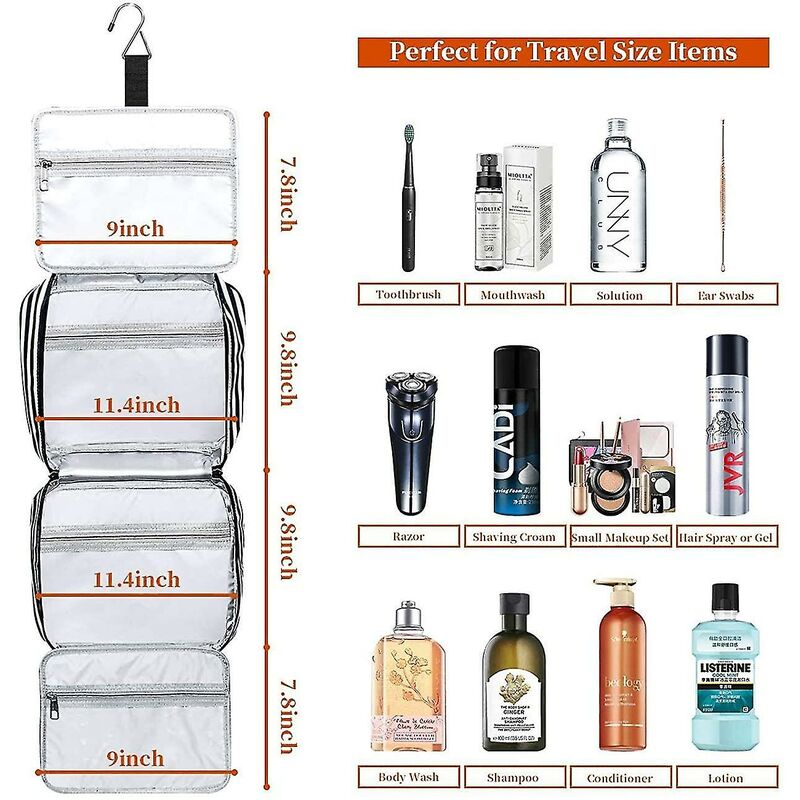 Tela, pelle PU Fodera in PVC Cerniera Cerniere lampo Qualità superiore Materiali lavabili in lavatrice - Morbido tessuto a righe imbottito, doppie cerniere affidabili, ogni dettaglio è realizzato con delicatezza, offrendoti un'esperienza di utilizzo di alta qualità che durerà a lungo. Design degli interni impermeabile e impermeabile - Non solo i tuoi articoli da toeletta non coleranno nella tua valigia durante il viaggio, ma puoi anche usarli sotto la doccia come una borsa da doccia organizzata perché il materiale può facilmente resistere all'acqua . Grande capacità: puoi mettere trucco, shampoo, spazzolino da denti, dentifricio, ecc. Tutto in un unico posto. Viaggia comodamente per avere tutte le tue necessità in una borsa. Scomparti multipli - Quattro scomparti principali interni mantengono i tuoi articoli da toeletta e cosmetici in posizione e una tasca frontale con cerniera che fornisce spazio extra con facilità. Robusto design del gancio - Il gancio integrato consente di