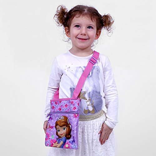 Borsa Tracolla Piatta Rosa Sofia La Principessa da Bambina - Pratica Tracollina Messenger con Farfalle e Fiori su Sfondo Viola - Borsetta Regolabile da Viaggio e Tempo Libero - 17x21 cm - Perletti