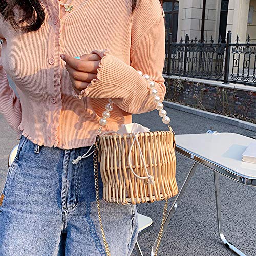 Borsa a Tracolla in Rattan Intrecciata Borsa a Mano con Catena di Perle Borsa da Spiaggia Paglia Estiva Borsa Paglia Mare Donna Borsa a Secchiello Moda (Rotonda)