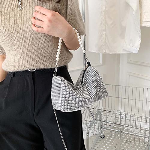 Borsa a tracolla con strass da donna borsa con strass solido catena di perle borsa portatile con strass borsa a tracolla con diamante brillante femminile borsa a tracolla frizione da sera, Argento