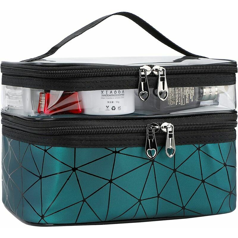 Materiali di alta qualità: i nostri beauty case sono realizzati con materiali ecologici in PU e TPU, progettati con robuste doppie cerniere. Che è resistente, impermeabile e facile da pulire. Design a doppio strato: è diverso dalla trousse cosmetica a spazio singolo nella vita quotidiana, che ha un design a strati e con un elastico nello strato inferiore che ti rende più comodo ordinare e conservare. Ampia applicazione: ideale per conservare fondotinta, correttore, mascara, ombretto, cipria, fard, profumo, dentifricio, pettine, rossetto durante i viaggi, viaggi di lavoro o nuotare. Facile da riporre in valigia o sulla scrivania. Grande capacità: la borsa da toilette misura 23 x 17 x 16 cm / 9 x 6,7 x 6,3 pollici, sufficiente per contenere cosmetici quotidiani, articoli da toeletta, prodotti per unghie e pelle prodotti per la cura. Manterrà le tue cose pulite e organizzate. La scelta migliore per il regalo: borse portaoggetti portatili di grande capacità e maniglia superiore, che ti