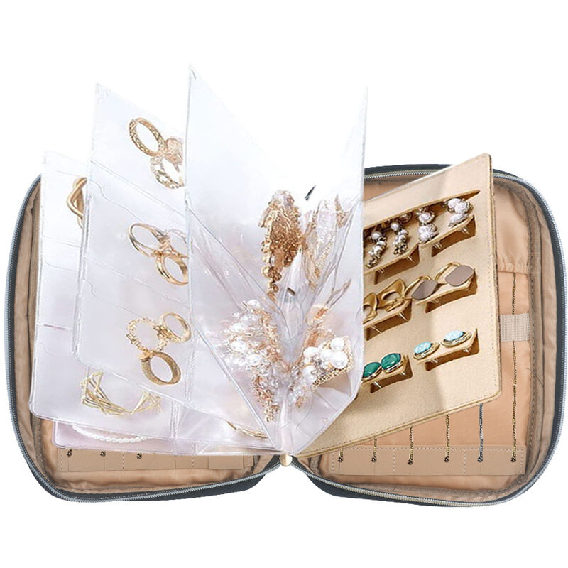 Una robusta borsa portagioielli da viaggio decorata con un lucido motivo simmetrico. Realizzata in buon tessuto di poliestere, è robusta e resistente a graffi, macchie e altre contaminazioni. La borsa per gioielli misura 25x17x4,5 cm ed è spaziosa (5 cinturini per collane, 24 paia di pannelli per orecchini, 2 cinghie ad anello, 1 doppia tasca aggiuntiva). Niente più grovigli e perdite: le collane sono visibili attraverso tasche separate e elastico centrale per evitare qualsiasi rischio di groviglio o graffio. La cerniera bidirezionale in oro rosa mantiene i gioielli in posizione senza perderli. Il morbido materiale interno in pelle scamosciata protegge i tuoi gioielli senza danneggiarli. Mettendo la comodità del cliente al primo posto, il portagioielli è progettato per gli amanti dei gioielli per farti sentire il più a tuo agio possibile. Tasche a vista trasparenti e bottoni magnetici sugli orecchini e cinturini a doppio anello sono adatti alla vita quotidiana. Custodia da trasporto