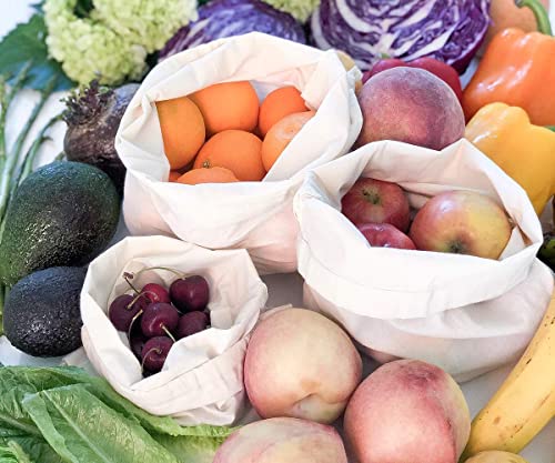 Borse in cotone vegetale - Set di 4 sacchetti in mussola di cotone biologico (2 di L, 1 di M & S) Forza a doppio punto, peso della tara sui cartellini con coulisse, conservare i tuoi prodotti