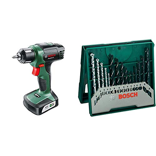 Bosch 06039B3000 Avvitatore EasyDrill 12, 12 V, Verde + 2607019675 X-Line Set Mini, 15 Punte, Metallo Legno Muro