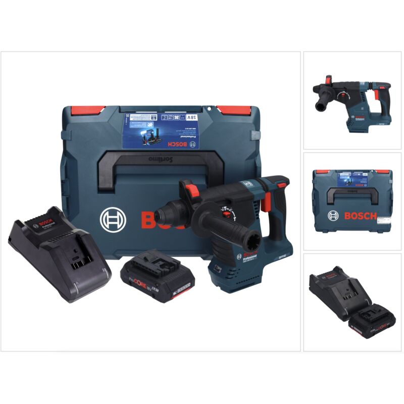 Contenuto della consegna: - 1x trapano a percussione professionale a batteria Bosch GBH 18V-24 C - 1x impugnatura supplementare ( 2602025141 ) - 1x arresto di profondità ( 1613001009 ) - 1x batteria Bosch GBA 18 V 4,0 Ah ProCORE ( 1600A016GB ) - 1x caricabatterie Bosch GAL 18V-40 ( 1600A019RJ ) - 1x L-BOXX - 1x inserto coordinato Descrizione del prodotto: Il GBH 18V-24 C Bosch Professional è un trapano a percussione a batteria potente e versatile con un'elevata energia di percussione di 2,4 J e una tensione della batteria di 18 V. Con una velocità di percussione da 0 a 4.350 bpm e una velocità nominale da 0 a 980 min-1, svolge il lavoro in modo rapido ed efficiente. Il peso ridotto di 2,9 kg lo rende un partner affidabile per tutti i lavori di foratura. Grazie al portautensili SDS plus, è in grado di affrontare facilmente lavori pesanti nel calcestruzzo e nel metallo. La sua capacità di foratura nel calcestruzzo con ganasce a martello è compresa tra 4 e 24 mm, e raggiunge una
