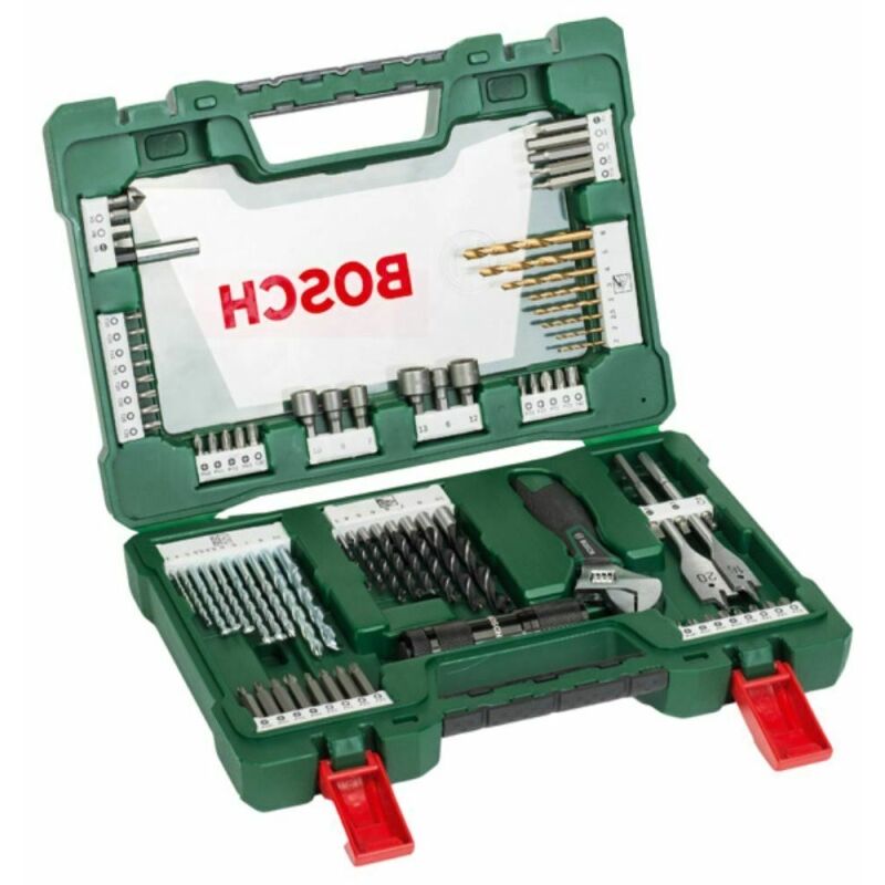Set 83pz. di punte per foratura e bit di avvitamento V-Line Bosch Il set comprende 83 pz tra punte per foratura, bit di avvitamento, punte per legno dal leggero peso di 1,8 kg, il tutto fornito in una comoda valigetta. Contenuto della valigetta 8 punte per metallo HSS-TiN Ø 2-6 mm 10 punte per pietra in metallo duro Ø 3-10 mm 8 punte per legno Ø 3-10 mm 2 punte fresatrici piatte, Ø 16/20 mm 32 bit di avvitamento L = 25 mm PH 0/0/1/1/2/2/3/3 PZ 0/0/1/1/2/2/3/3 SL 4/5/6 H 4/5/6 T 10/10/15/15/20/20/25/25/30/40 13 bit di avvitamento L = 50 mm PH 0/1/2/3 PZ 0/1/2/3 SL 5 T 15/20 6 chiavi a bussola Ø 6/7/8/10/12/13 mm Adattatore per chiavi a bussola Svasatore Portabit universale magnetico Chiave a rullina Torcia Tascabile Led