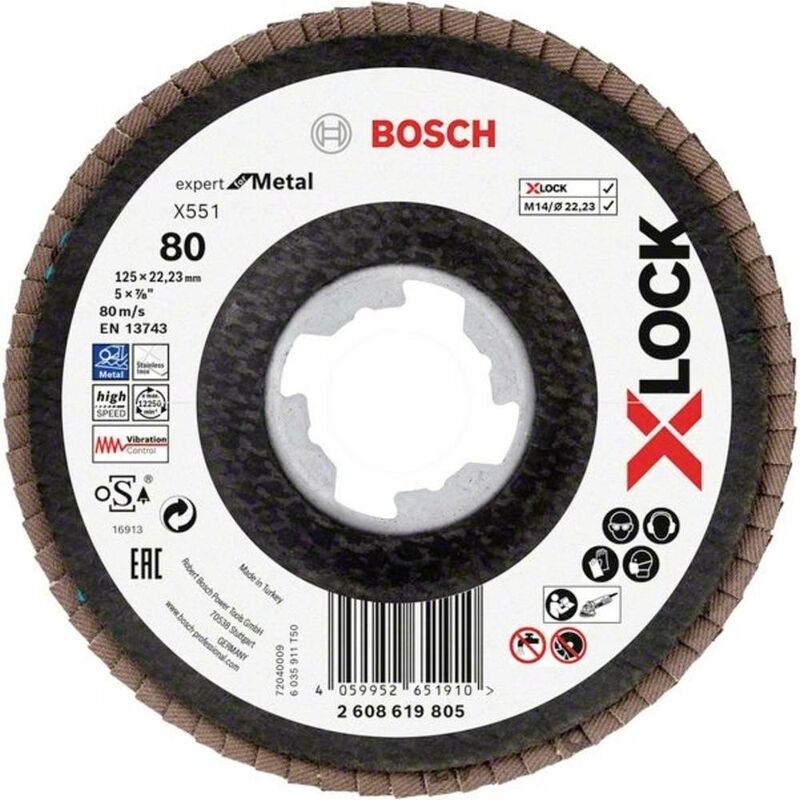 Dettagli tecnici Contenuto 1 pz. Dimensione, Ø 125 mm Dimensioni (Ø) 125 mm Grana Num. 80 Tipo prodotto Disco con falde Ø foro 22.23 mm X-LOCK X551 EXPERT FOR METAL FEATER, VERSIONE SBARRA Il disco abrasivo a lamelle X551 è molto apprezzato dai lavoratori in metallo per la sbavatura e la pulizia di saldature su acciaio da costruzione e acciaio inox. La versione piegata, la parte posteriore stabile e la grana altamente abrasiva del disco abrasivo a lamelle X551 garantiscono un'elevata velocità di asportazione del materiale e prestazioni costanti. In questo modo è possibile levigare rapidamente anche con piccole smerigliatrici angolari superfici in acciaio inox e costruzione. Il disco abrasivo a lamelle X551 è un accessorio affidabile per sbavare, pulire e riparare rapidamente saldature su acciaio inox e da costruzione. Con X-LOCK è sufficiente un clic: Il sistema di sostituzione più veloce per gli accessori disponibili sul mercato. Adatto anche per smerigliatrici angolari con dado e