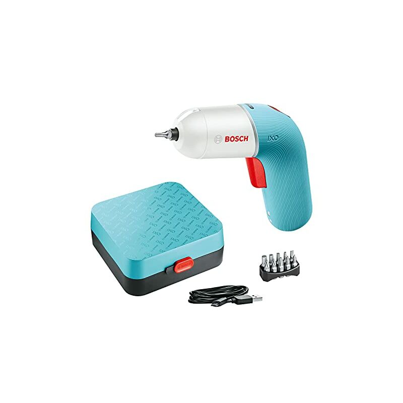 Bosch - Avvitatore a batteria IXO (6a generazione, bianco/blu ghiaccio, controllo variabile del numero di velocità, ricaricabile tramite cavo micro USB, in scatola di immagazzinamento
