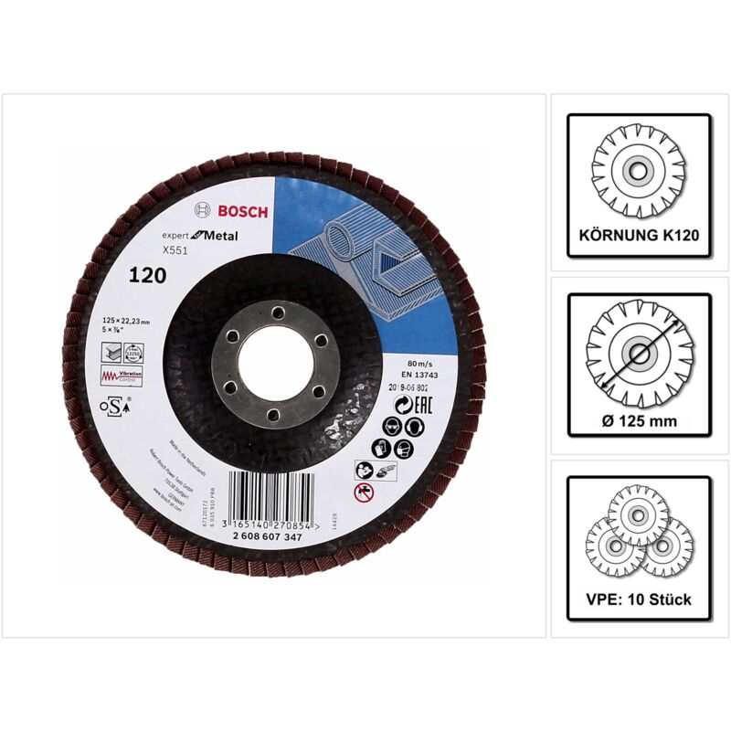 Dotazione: - 10x Bosch Discho lamellare X551 Expert for Metal 125mm, K120 ( 2608607347 ) Descrizione prodotto: Il disco lamellare X551 Expert for Metal (EfM) ha un tasso di rimozione del materiale impressionante sulle superfici metalliche. Il grano abrasivo di ossido di zirconio rinforzato con ossido di alluminio e corindone semiprezioso offre le migliori prestazioni di rimozione del metallo e assicura una lunga durata di vita utile. Inoltre, il tessuto X, estremamente robusto, funge da supporto stabile per una lunga durata e per prestazioni elevate e costanti su superfici difficili. La completa adesione della resina sintetica dei grani abrasivi al tessuto X garantisce prestazioni ottimali dell'abrasivo. È destinato alla sbavatura e alla preparazione di lavori di saldatura su acciaio al carbonio, acciaio da costruzione, alluminio, altri metalli non ferrosi e ghisa. È ideale anche per rimuovere scolorazioni, depositi e difetti superficiali. L'X551 Expert for Metal è compatibile con le