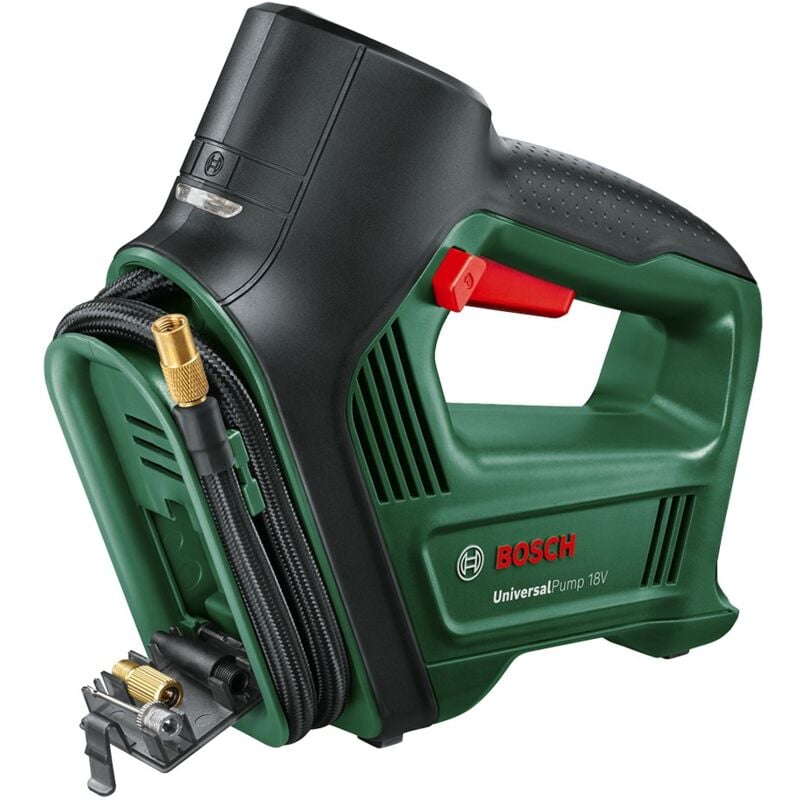 Gonfiatore BOSCH HG UniversalPump 18V - È un gioco da ragazzi: il Gonfiatore universale da 18 V è tutto ciò di cui hai bisogno per gonfiare velocemente —fino a 30 litri al minuto— ed è molto comodo e facile da usare - Essendo uno strumento cordless, può essere utilizzato ovunque, su pneumatici di auto e biciclette o altri oggetti che devono essere gonfiati, e si avvia rapidamente con un semplice controllo della punta delle dita grazie a un controllo di velocità - Un manometro illuminato mostra chiaramente le misurazioni della pressione, il che è molto utile in condizioni di scarsa illuminazione - Una volta terminato il lavoro, tutti gli accessori e il tubo possono essere riposti direttamente nella parte anteriore dell'utensile - POWER FOR ALL: una batteria ed un caricabatterie per un'intera gamma di utensili Home & Garden - Categoria Universal: focalizzato su funzionalità e prestazioni per una più ampia gamma di applicazioni, per lavori di media portata