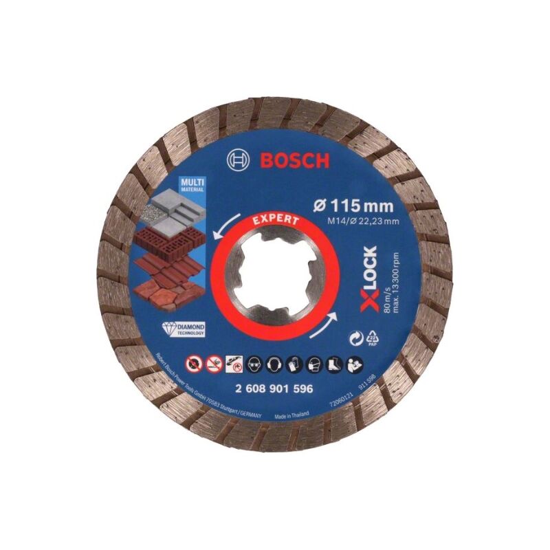 Dura fino a due volte di più rispetto alla mola da taglio de taglio Bosch Eco per Universal Taglienti de eccezionalmente durevoli grazie alla tecnologia BoschDiamond. Con alesaggio da 22,23 mm per bloccaggio convenzionale dado per smerigliatrici . Ideale per il taglio di diversi materiali come calcestruzzo, mattoni, pietra tenera e piastrelle, por ad esempio per il taglio di lastre di pietra e materiali da muratura de. La fornitura comprende: Bosch Disco de Taglio con Diamond EXPERT MultiMaterial X-LOCK Turbo - Ø 115 x 22,23 mm