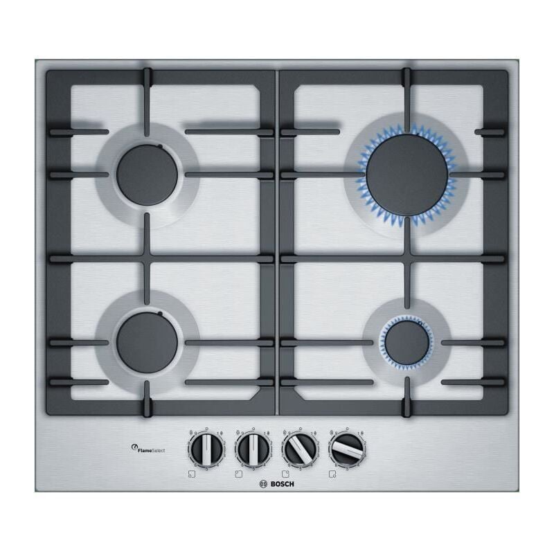 BOSCH - Tavolo da 60 cm a gas in acciaio inossidabile - 4 fuochi - Tecnologia FlameSelect - Maniglia a rombo - Accensione elettrica con una mano - Sicurezza gas con termocoppia - Supporti in ghisa - Potenza di collegamento 7,5 kW