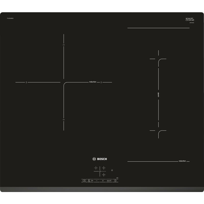Piano cottura in vetroceramica BOSCH PVJ631BB1E. Tavolo a induzione per cucinare velocemente, in sicurezza, con poca energia. DirectSelect: consente l'accesso diretto alle zone di cottura, potenze e funzioni del piano. Tavolo a induzione: veloce, preciso, facile da pulire e con bassi consumi energetici. PowerBoost: fino al 50% di potenza in più per cotture più veloci. Timer con funzione di arresto: disattiva la zona di cottura selezionata allo scadere del tempo programmato. Display digitale Comando TouchSelect (+/-) Comfort / Sicurezza: Funzione QuickStart: rilevamento automatico dei contenitori accesi la funzione Re-Start zona di cottura: in caso di arresto improvviso del piano, memorizzazione della temperatura iniziale per 4 secondi. Gruppo di prodotti: piano cottura. Nome del prodotto / famiglia: Focolare in vetroceramica. Tipo di costruzione: Built-in. Tipo di controlli: elettronico. Sistema di controllo: nella parte anteriore, controllo TouchControl (+/-). Tipo di energia