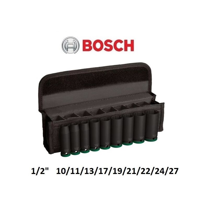 BOSCH SERIE CHIAVI A BUSSOLA LUNGHE MACCHINA ESAGONALI 1/2 PRO IMPACT 9 PZ QUALITA PROFESSIONALE IL KIT INCLUDE 1 CUSTODIA MORBIDA PORTABUSSOLE 9 BUSSOLE ESAGONALI PROFONDE MISURE - 10 / 11 / 13 /17 /19 / 21 / 22 / 24 / 27 DETTAGLI TECNICI ATTACCO QUADRO BUSSOLE - 1/2 LUNGHEZZA BUSSOLE IN (mm) - 77 CODICE DEL PRODOTTO - 2608003040 Acciaio al cromo-molibdeno per ottenere resistenza a coppie elevate SET BUSSOLE PRO IMPACT PER UN AVVITAMENTO SOLIDO DESCRIZIONE Puoi usare il set bussole PRO Impact su viti, bulloni e dadi esagonali con la tua chiave a testa quadrata. L'abbiamo progettato per aiutarti nelle attività di avvitamento per le installazioni negli stabilimenti o ogni altro tipo di lavoro industriale pesante. Abbiamo realizzato le bussole del set PRO Impact in acciaio CRMO (cromo-molibdeno) termo trattato e le abbiamo dotate di pareti spesse per accertarci che resistano alle coppie elevate. Abbiamo aggiunto un rivestimento in fosfato nero per proteggerle da ruggine e corrosione. Le